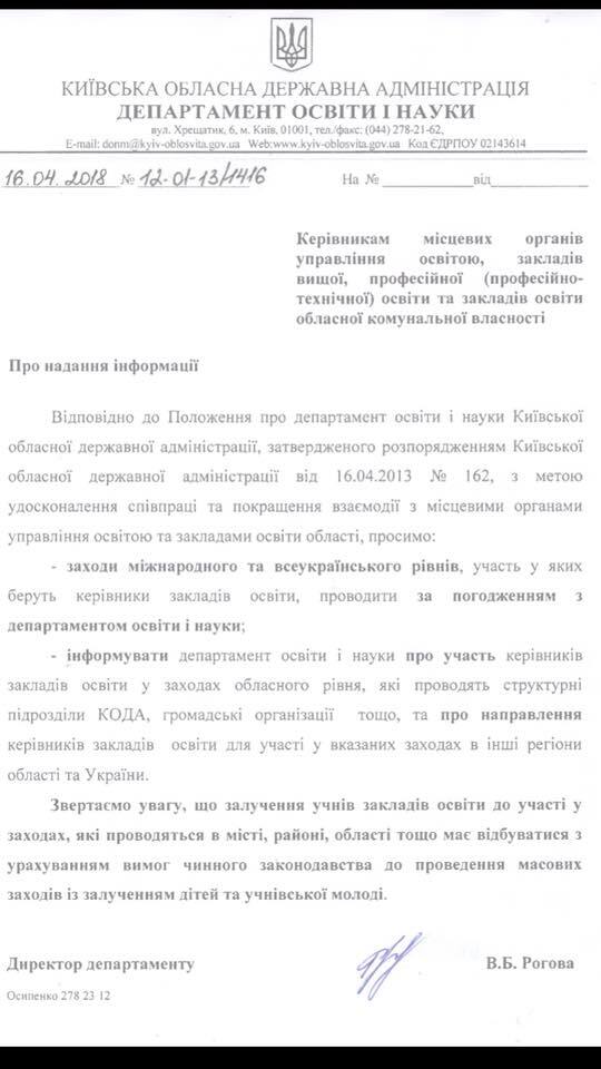 Она добавила, что через несколько дней каждое учебное заведение Киевской области получило письмо, что принимать участие в Международных или Всеукраинская проектах учебные заведения могут только по согласованию с департаментом образования.