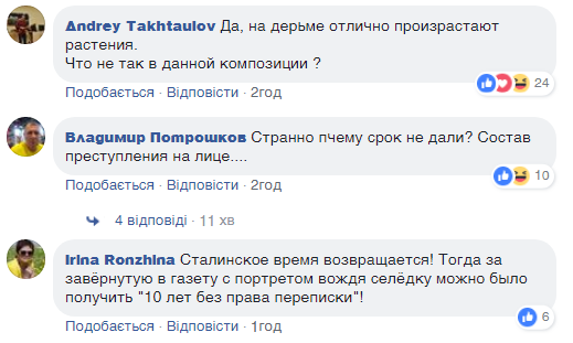 "Да, на дерьме отлично произрастают растения. Что не так в данной композиции?" "Странно, почему срок не дали", "Сталинское время возвращается! Тогда за завернутую в газету с портретом вождя селёдку можно было получить 10 лет без права переписки", "Кстати, запрещение картины "9 стадий разложения вождя" - это 10-я стадия разложения вождя", - отметили пользователи сети, комментируя данную новость.