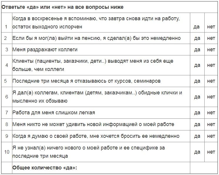 негативный настрой по отношению к привычным задачам, отсутствие креативности и мотивации, неудовлетворенность работой;